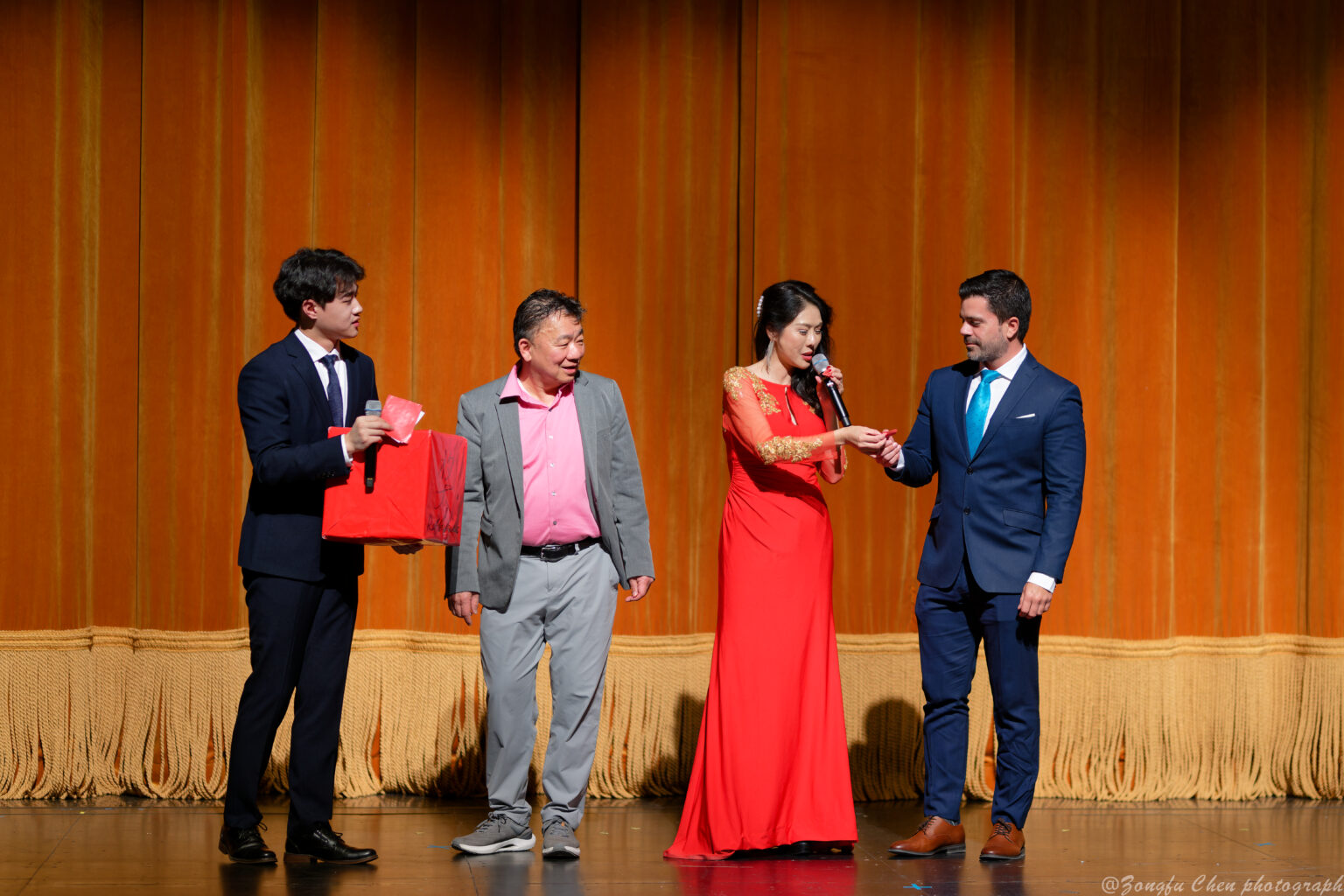 Mr. Dave Jiao, Chairman of the Pittsburgh Chinese Cultural Center, Mr. Chris Brussalis, President of Point Park University, and Ms. Kiesha Lalama, Head of the Art Department at Point Park University and Head of Pittsburgh Playhouse, took the stage first. They spoke on behalf of the organizers and co-organizers, expressing gratitude to all performers, volunteers, and sponsors for their amazing support. They welcomed all the attendees and concluded with blessings for the Year of the Dragon in Chinese to all audience friends!