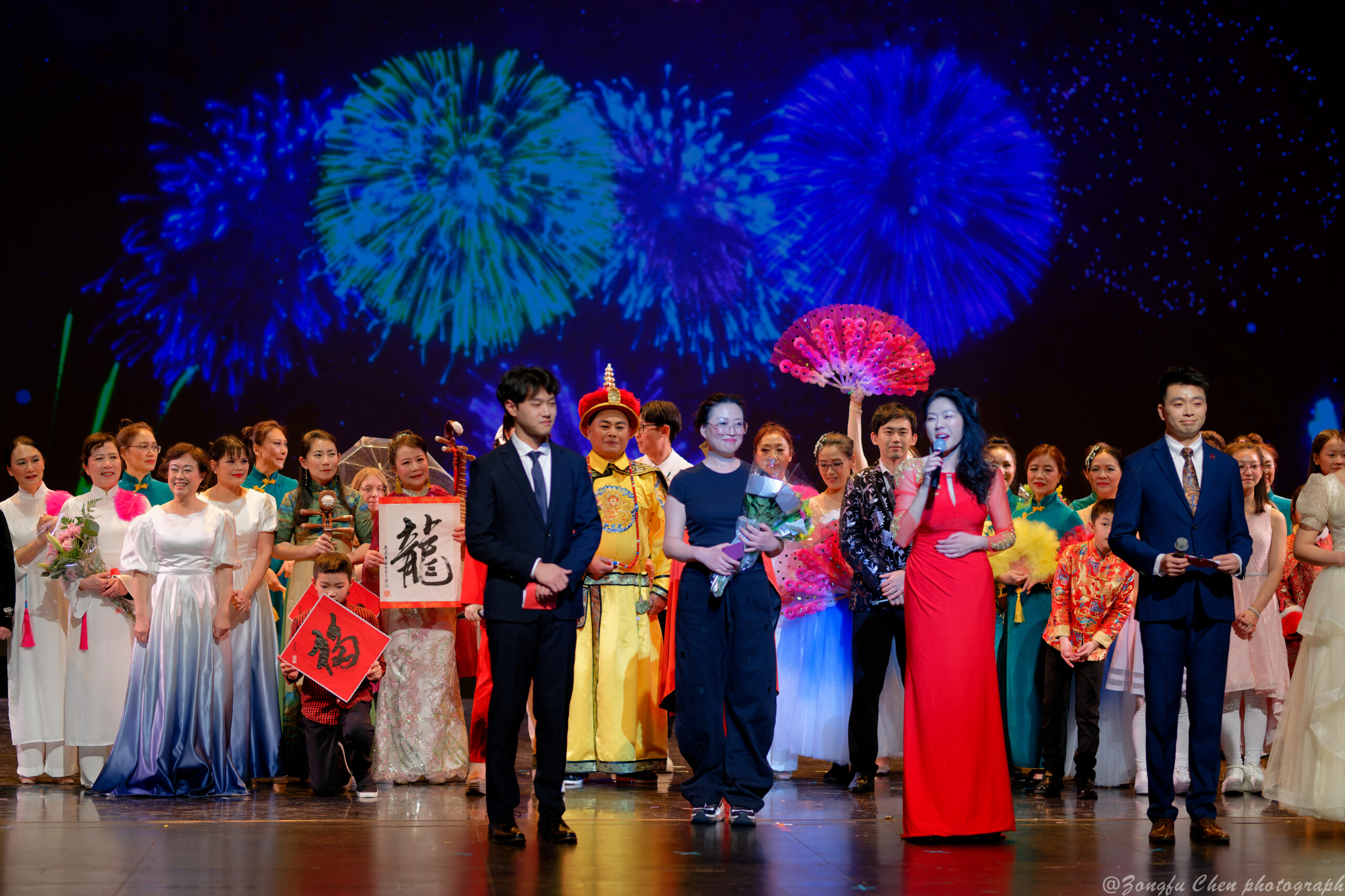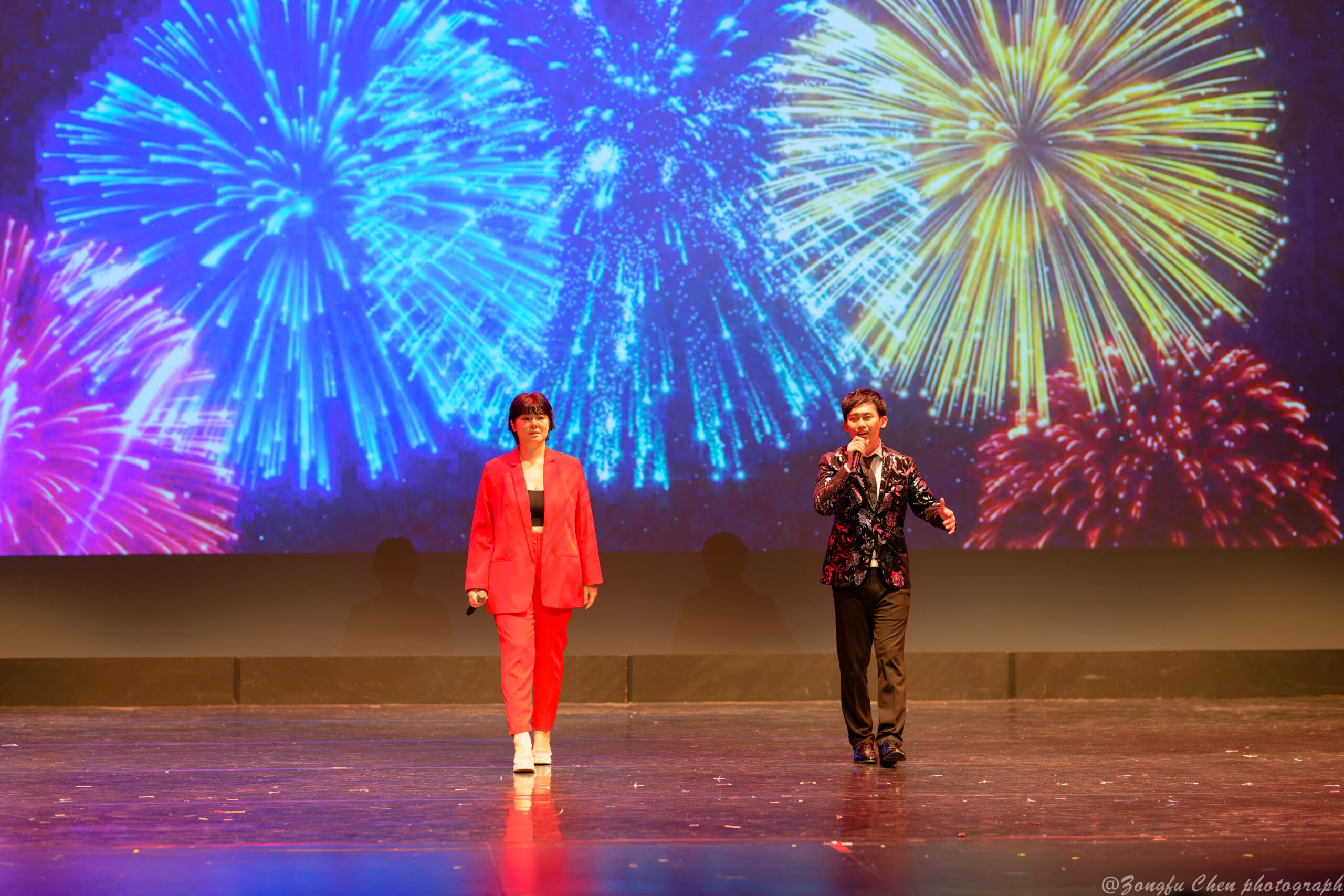 美好的时光总是太短暂。在晚会的最后,刘瀚博先生和许筱婷女士倾情领衔演唱 “今夜无眠”,今宵难忘,期待明年再会。在全体观众的鼓掌欢呼声中,全体演职人员一同上台谢幕,祝福所有大匹兹堡地区的华人朋友们新的一年宏图大展,龙年大吉!Good times always pass too quickly. At the end of the gala, Mr. Liu Hanbo and Ms. Xu Xiaoting performed “Sleepless Tonight” with heartfelt passion. As this memorable night was about to end, we looked forward to meeting again next year. With applause and cheers from the audience, all performers came on the stage to take a bow together, and wished all friends in the Greater Pittsburgh area a prosperous Year of the Dragon!