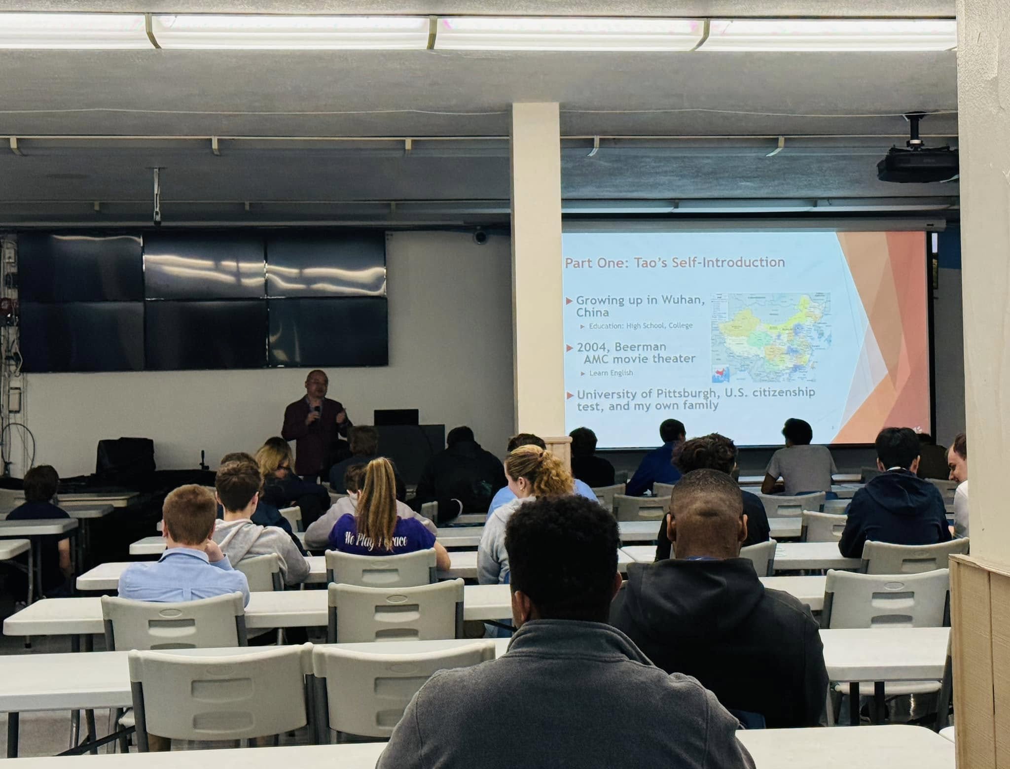 4月28日上午,匹兹堡中华文化中心应邀参加了Bishop Canevin High School 的国际日活动。文化中心董事何涛和桑庆子与二百多名高中学生和老师分享了传统中国文化和美国华人的历史,现场同学们踊跃参与和提问,活动深受欢迎。